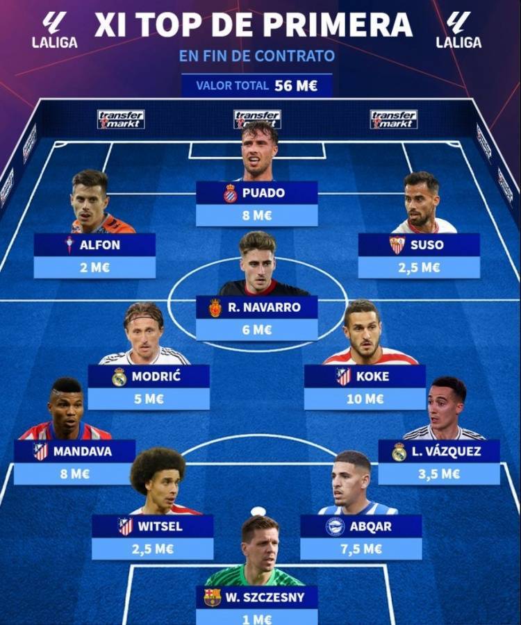直播吧5月22日讯 2024-25赛季行将结束,多名西甲球星面临成为自由球员的局面,德国转会市场盘点出了西甲自由球员身价最高阵,莫德里奇、什琴斯尼领衔,巴斯克斯、维特塞尔、科克、苏索在列。